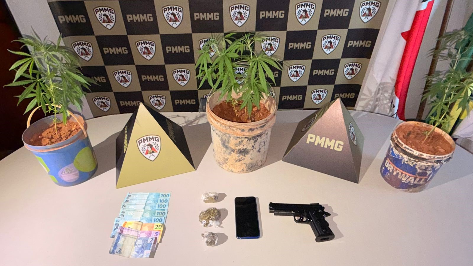 Foi realizada busca domiciliar no endereço indicado, onde foram localizados outros tabletes de maconha, dinheiro em notas diversas, um simulacro de arma de fogo tipo pistola e cinco pés de maconha cultivados em vasos nos fundos do imóvel. Ao todo, foram apreendidos: Três tabletes de maconha; cinco pés de maconha; R$ 527,00 em dinheiro; um simulacro de arma de fogo tipo pistola e um aparelho celular.
