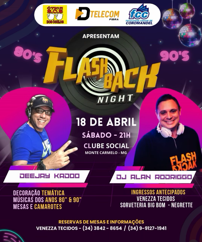 A cidade de Monte Carmelo se prepara para uma noite marcada por nostalgia, música e muita animação. Nesse sábado, 18 de abril, acontece a Flash Back Night, um evento dedicado aos grandes sucessos das décadas de 80, 90 e 2000.