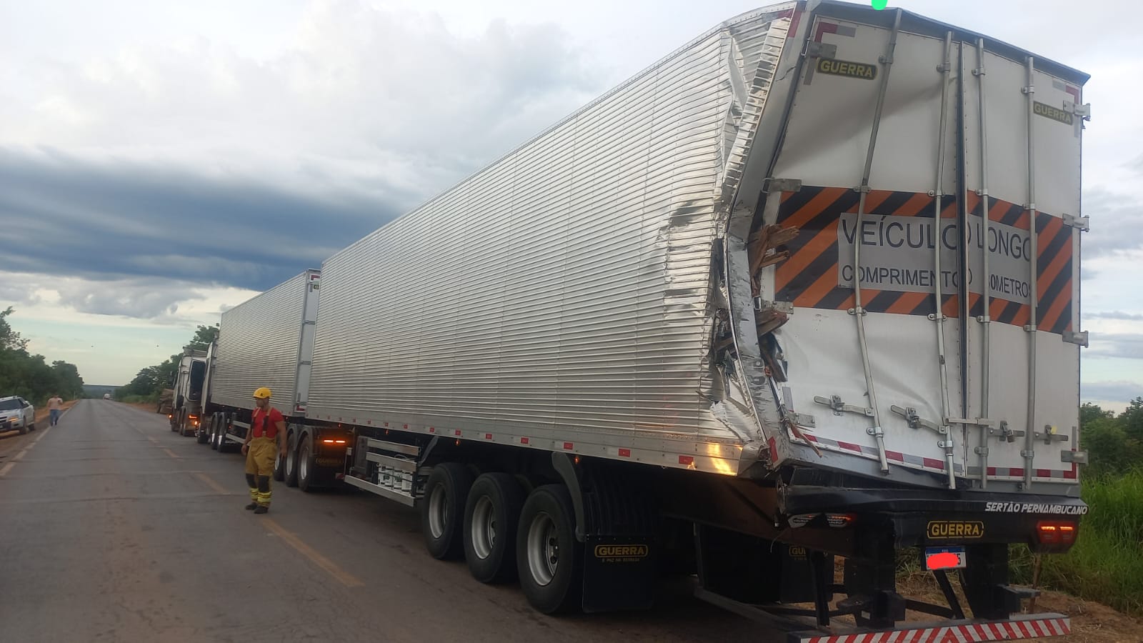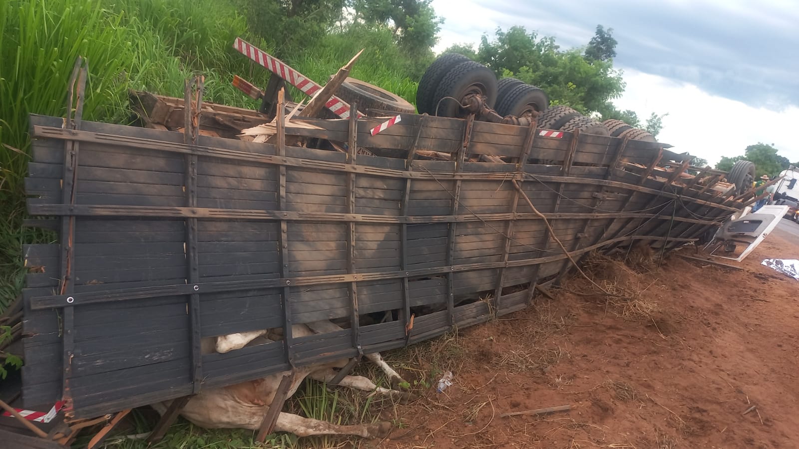 O condutor que dirigia a carreta relatou que seguia sentido decrescente da via que ao reduzir o veículo para passar nas lombadas, percebeu que um caminhão havia batido na traseira do seu veículo e capotou às margens da rodovia. O caminhão que colidiu na traseira e capotou transportava 18 animais bovinos e devido ao sinistro morreram 03 animais bovinos e 15 estavam feridos.