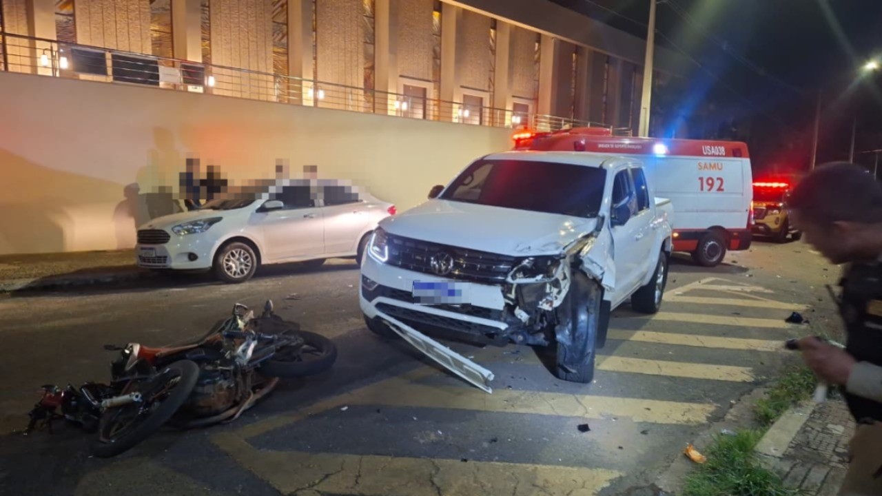 Com informações da Policia Militar por volta das 21h20min dessa quinta-feira (16) ocorreu um grave acidente de trânsito na área central de Monte Carmelo, envolvendo uma motocicleta e uma caminhonete. Durante patrulhamento preventivo a equipe da motopatrulha da PM visualizou o condutor da motocicleta realizando manobras perigosas em via pública, sendo emanadas ordens legais de parada, as quais foram desobedecidas, iniciando-se fuga em alta velocidade. O acompanhamento do veículo em fuga se estendeu pelos bairros Vila Nova, Montreal e Centro, ocasião em que o condutor cometeu diversas infrações de trânsito, colocando em risco os demais usuários da via. Ao trafegar pela contramão na Rua João Pessoa e acessar o cruzamento com a Rua Tito Fulgêncio, também pela contramão da via, o condutor da moto colidiu frontalmente com uma caminhonete VW/Amarok que transitava regularmente, evidenciando o risco extremo gerado pela conduta imprudente e pela desobediência às ordens policiais. O motociclista de 22 anos, sofreu múltiplas fraturas, foi socorrido pelo SAMU e encaminhado para atendimento especializado em Uberlândia. O condutor da caminhonete não sofreu lesões.