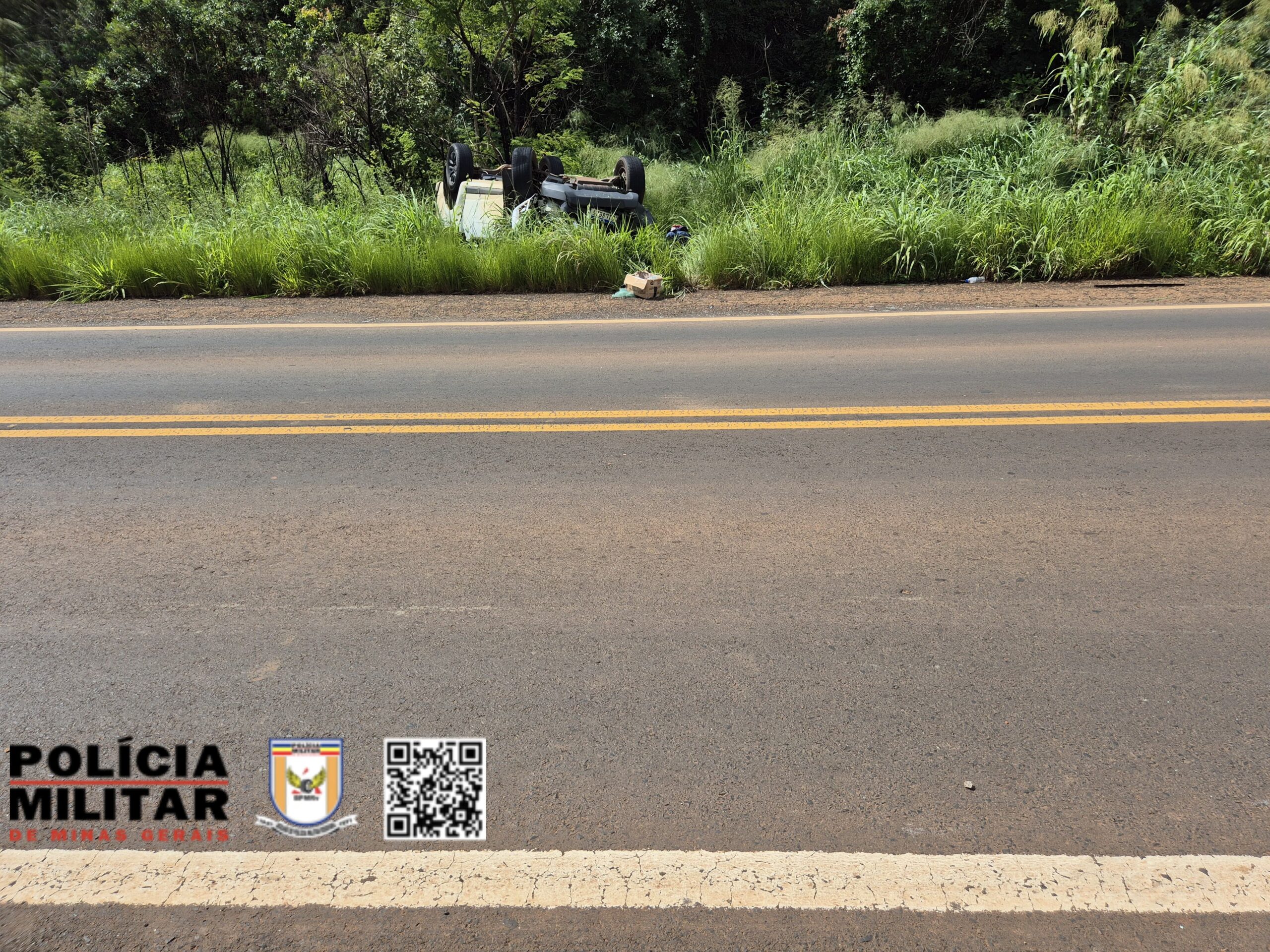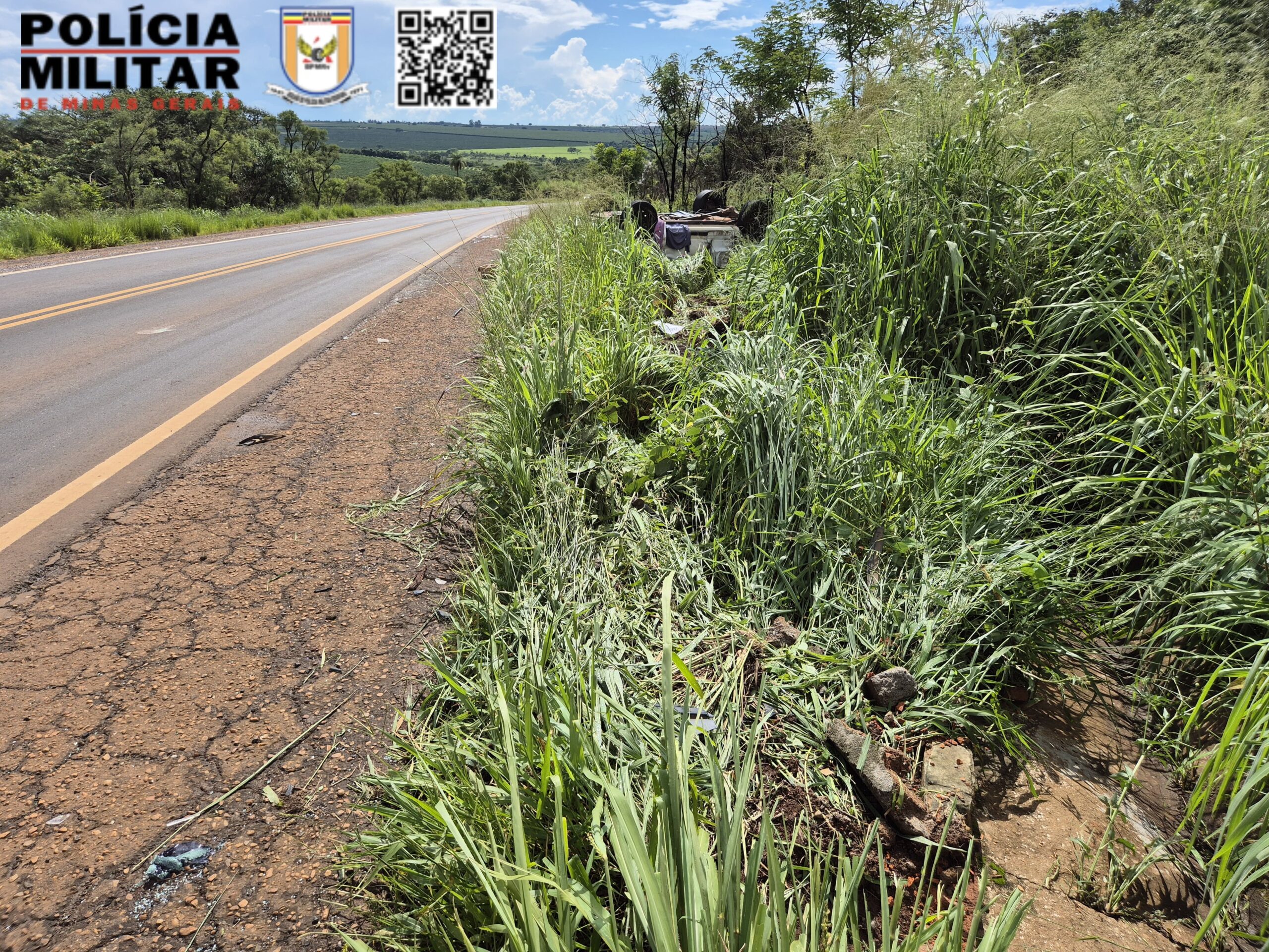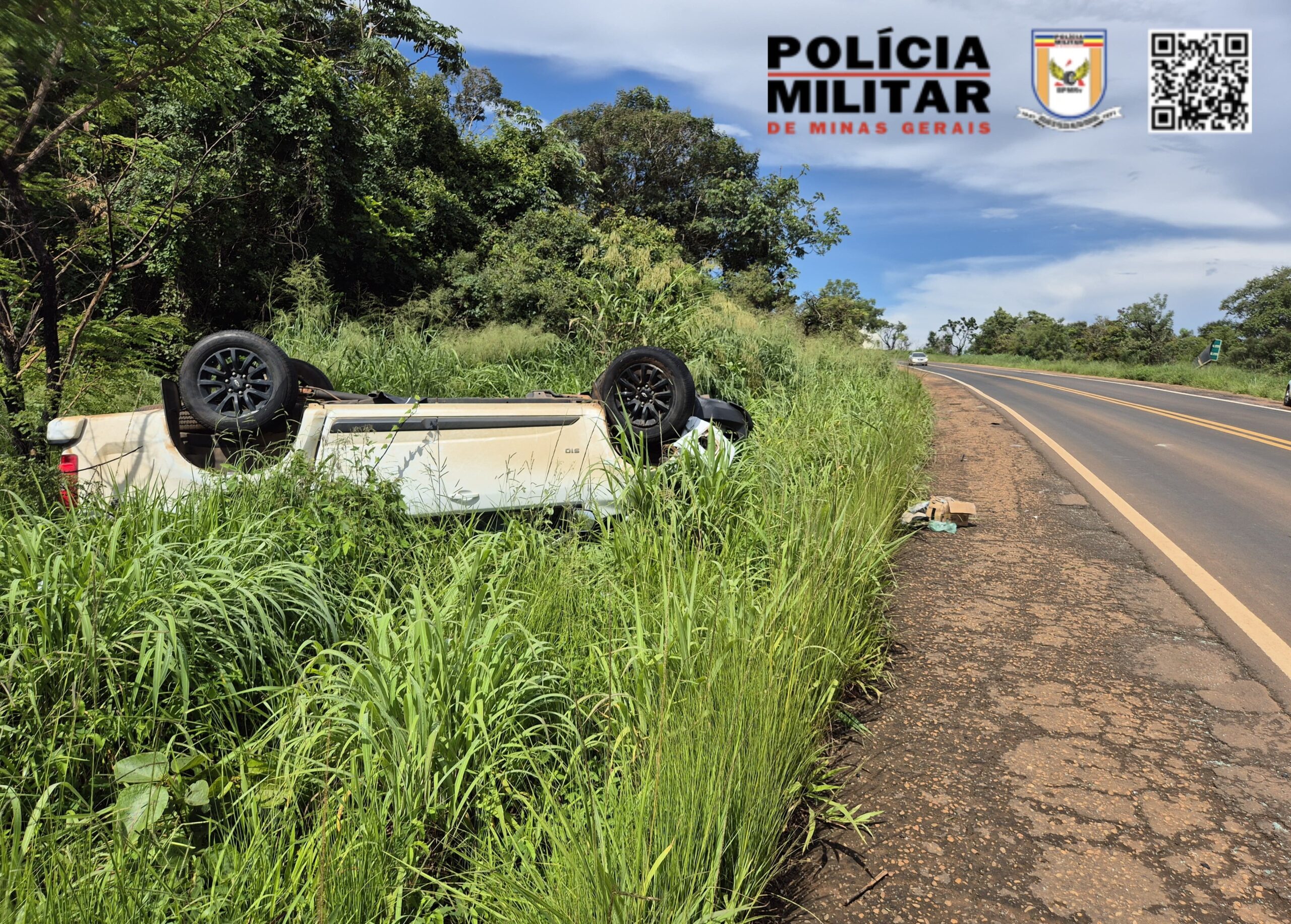 A Polícia Militar Rodoviária compareceu no Km 54 da Rodovia Estadual MG 190, município de Romaria, para atendimento de um acidente de trânsito / capotamento, envolvendo 01 Caminhonete CHEVROLET/S10 com placas de Belo Horizonte.