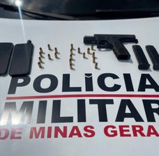 Diante dos fatos, foi desencadeada a operação policial e procedida a abordagem próximo ao posto de combustível em Celso Bueno, sendo veículo foi localizado uma pistola Taurus, cal 9mm, carregada com um carregador contendo 17 munições, também havia outro carregador com 17 munições e mais 17 munições em um maço de cigarros.