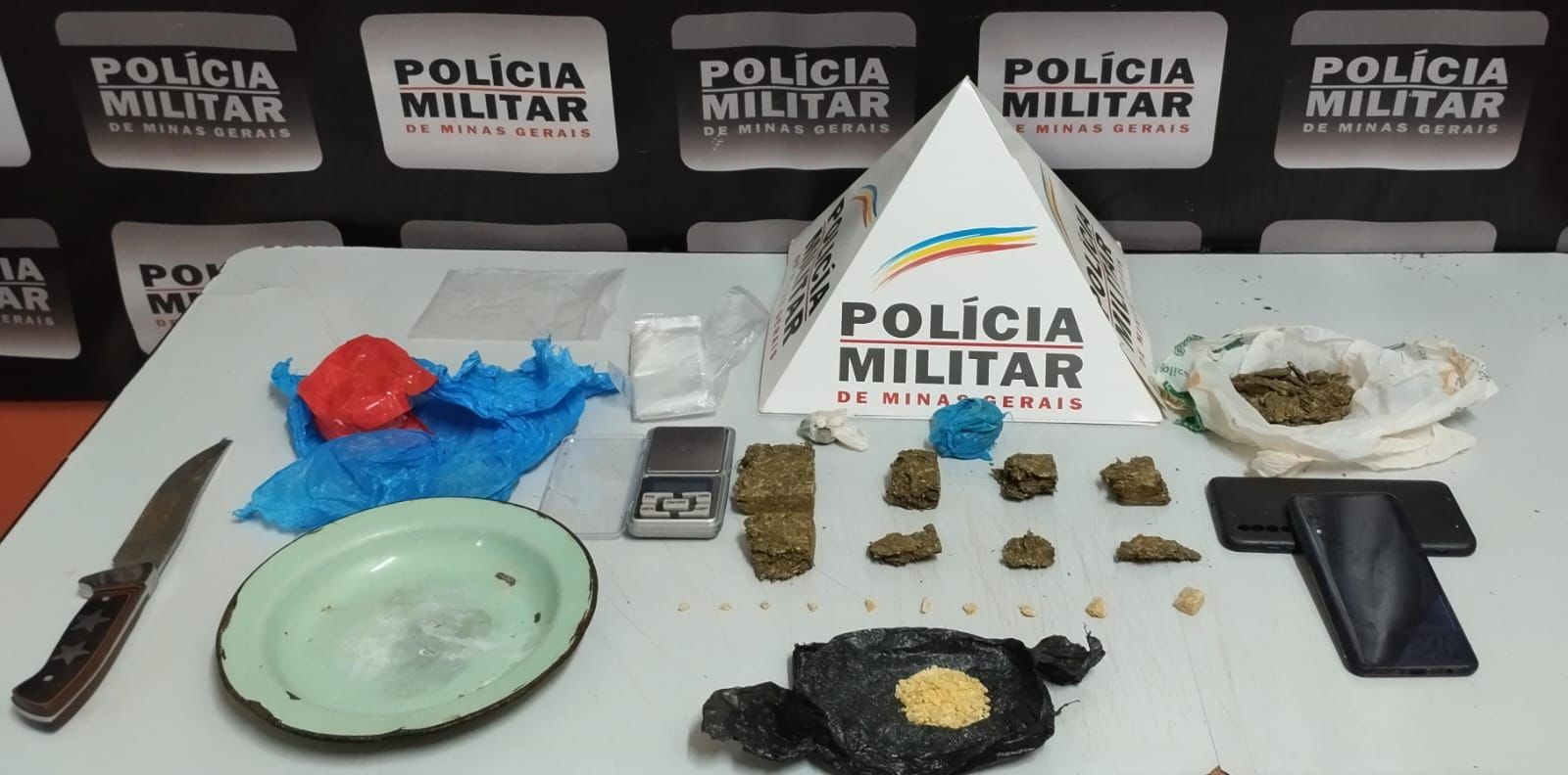 Durante as diligências, foram localizados entorpecentes, materiais típicos da comercialização de drogas e fios de cobre queimado, possivelmente fruto de furtos ocorridos recentemente.