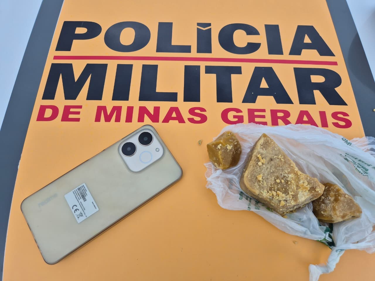 A substância entorpecente e um aparelho celular foram apreendidos pelo crime relacionado à narcóticos e entregues na Delegacia para as demais providências legais.