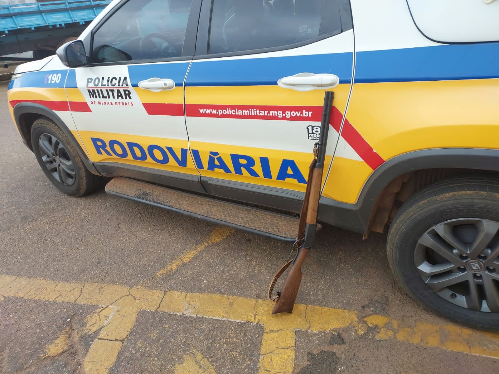 A Polícia Militar durante operação na Rodovia MG 190 próximo a Monte Carmelo, abordou uma caminhonete Fiat/Strada e durante a fiscalização foi encontrada sob o banco traseiro uma arma tipo Carabina calibre .38 e sob o banco do condutor 21 cartuchos intactos do mesmo calibre. O condutor não possuía a documentação específica para transportar a arma, sendo o autor de 56 anos, preso e arma e munições apreendidas e entregues na Depol de Patrocínio.
