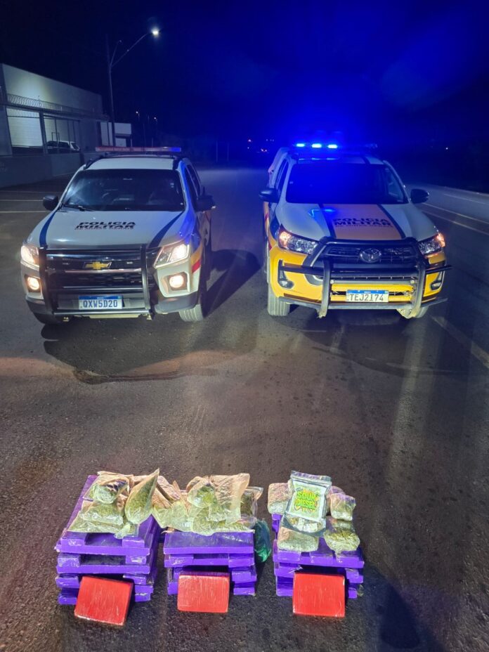 Enquanto realizava Operação Última Parada uma guarnição da Polícia Militar Rodoviária foi informada de que um veículo Fiat/Pálio cor prata, que seguia sentido Patos de Minas, estaria forçando ultrapassagens e colocando em risco os usuários da via. Diante da informação, as guarnições se deslocaram para a BR 365 e, ao visualizarem um veículo com características semelhantes ao do denunciado, determinaram que o condutor o parasse, no entanto, ele desobedeceu e evadiu em alta velocidade. Uma guarnição Tático Móvel e a Patrulha Rural se posicionaram no trevo da Serrinha com a BR 365 e determinaram que o condutor parasse, no entanto, ele novamente desobedeceu e tentou convergir na estrada da Serrinha, ocasião em que, devido à alta velocidade, saiu da estrada e colidiu com uma árvore, sendo dada voz de prisão aos dois homens que estavam no veículo, sendo um de 44 anos e outro de 29 anos. Segundo informações, a droga seria de Uberlândia com destino a Patos de Minas. Diante do exposto, os autores foram conduzidos ilesos à Delegacia de Polícia, juntamente com o material apreendido. 37 barras de maconha; 10 tabletes maconha; 01 pacote de maconha; 17 pacotes de maconha colombian gold; 03 barras de cocaína e 414 comprimidos de ecstasy.