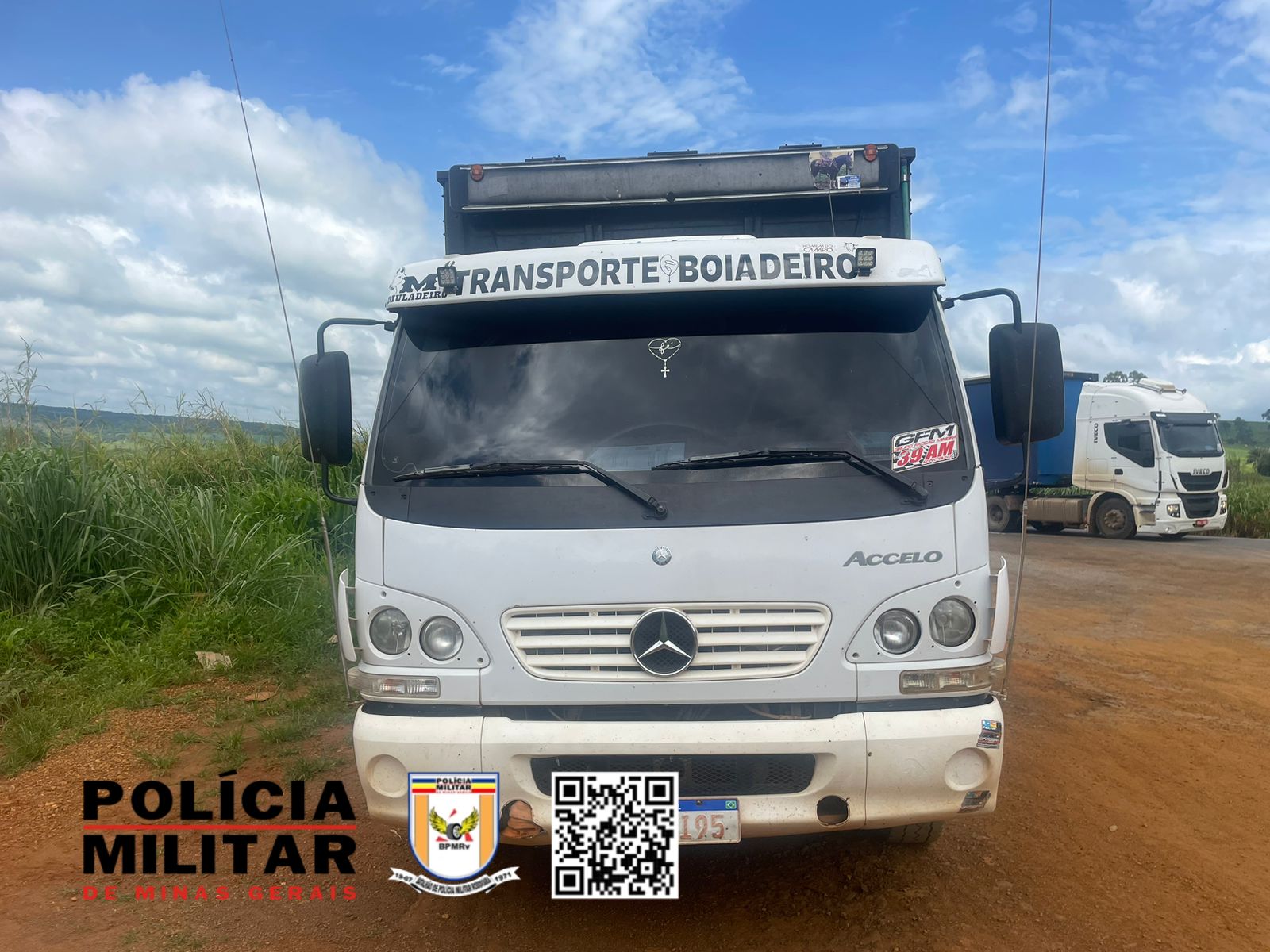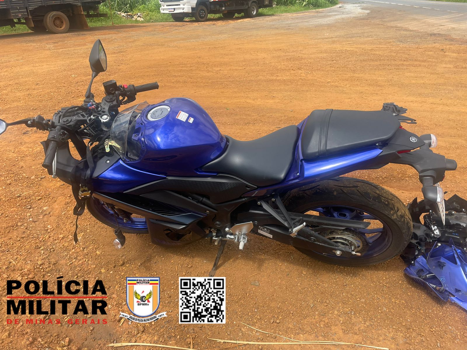 Ao chegar no local foi apurado que o caminhão M.BENZ , cor branca foi atingido na lateral esquerda pela motocicleta YAMAHA/YZ, cor azul, sendo que a colisão ocorreu devido o caminhão estar cruzando a pista de rolamento para ingressar na estrada vicinal de acesso à comunidade de Santiago quando foi colidido na lateral esquerda pela motocicleta que seguia sentido Presidente Olegário para Patos de Minas.