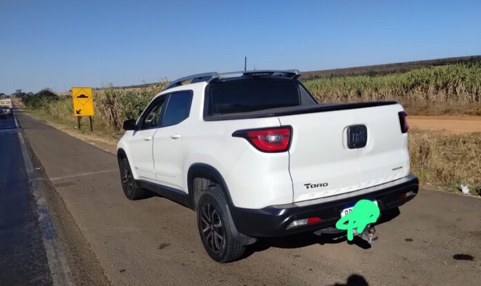 A Polícia Militar Rodoviária, durante operação na MG-223, km 0, no município de Monte Carmelo, abordou uma caminhonete Fiat/Toro de cor branca, emplacada em Caldas Novas.