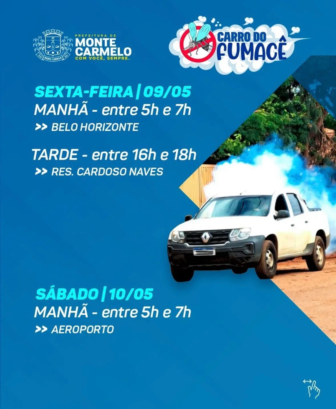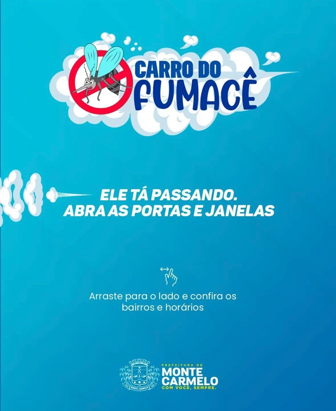A prefeitura reforça a importância de deixar portas e janelas abertas durante a passagem do carro fumacê, para que o inseticida tenha maior alcance e eficácia no combate ao mosquito Aedes aegypti.