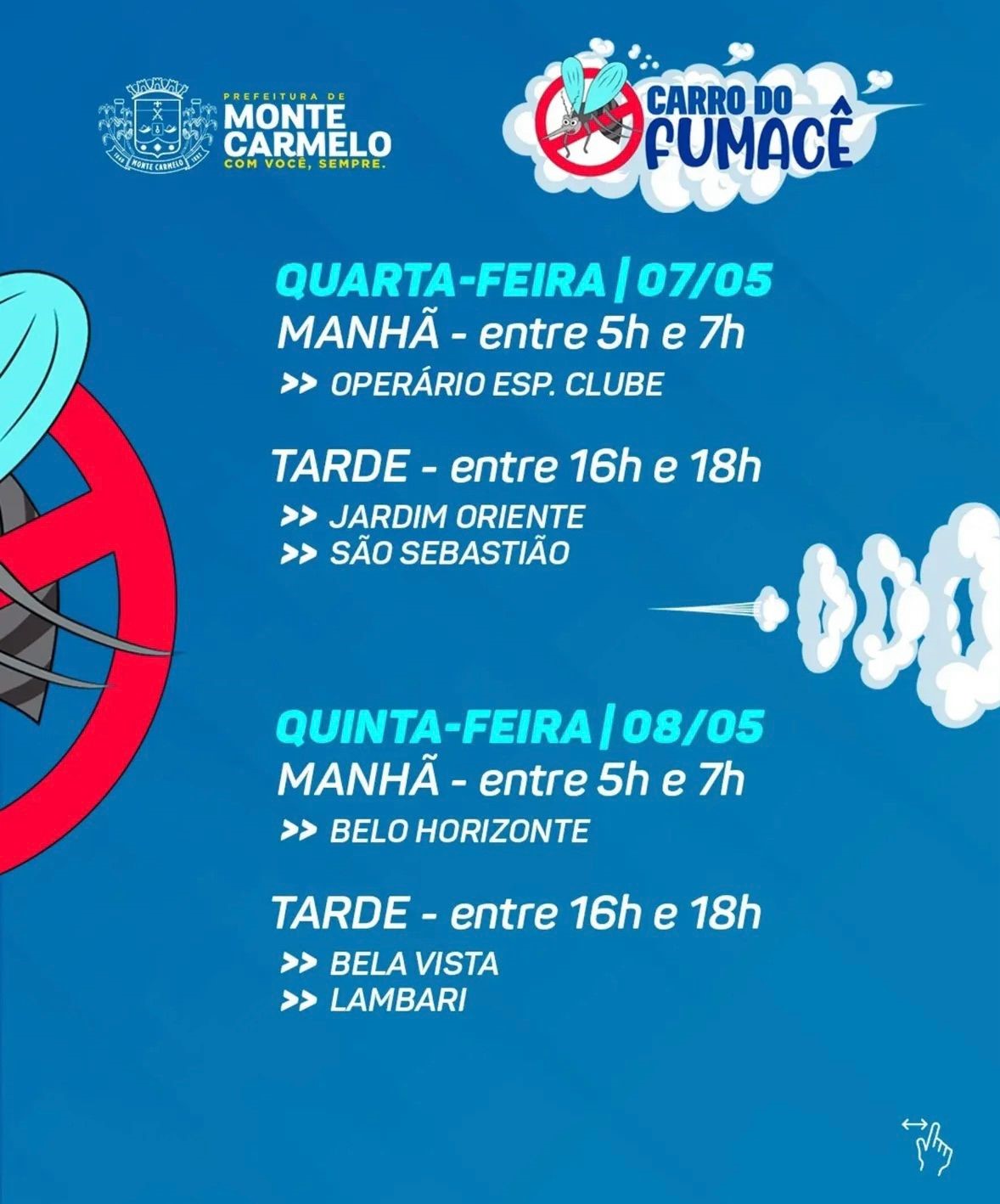 A Prefeitura Municipal de Monte Carmelo divulgou o cronograma do carro do fumacê para esta semana, em uma ação de combate à dengue. A medida é parte das ações emergenciais após o município registrar 222 casos da doença em 2025. Além disso, três óbitos estão sob investigação com suspeita de estarem relacionados à dengue.