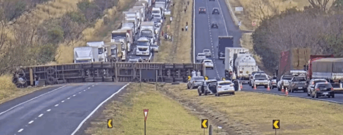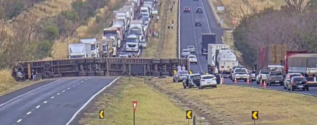 O tombamento de uma carreta no km 133 da BR-050, em Uberaba, deixou o trânsito totalmente interditado no sentido Uberlândia na tarde e início da noite deste domingo (21). O acidente aconteceu por volta das 16h, causando 11km de congestionamento. Por volta das 19h30, o tráfego foi liberado nas duas faixas. Conforme a concessionária Ecovias Minas Goiás, uma pessoa não se feriu e outra foi levada em estado moderado para o Hospital de Clínicas da Universidade Federal do Triângulo Mineiro (HC-UFTM), em Uberaba. As causas do acidente não foram informadas.