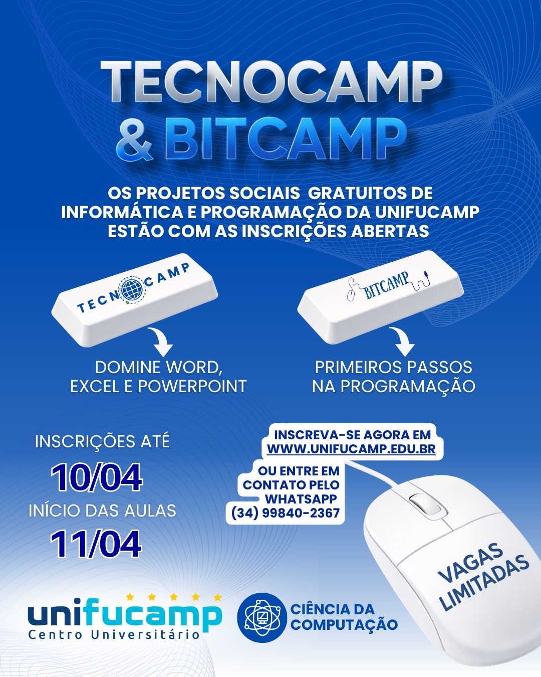O Centro Universitário UNIFUCAMP está com inscrições abertas para os projetos Tecnocamp 2026 e Bitcamp 2026, que oferecem cursos gratuitos nas áreas de informática e programação.