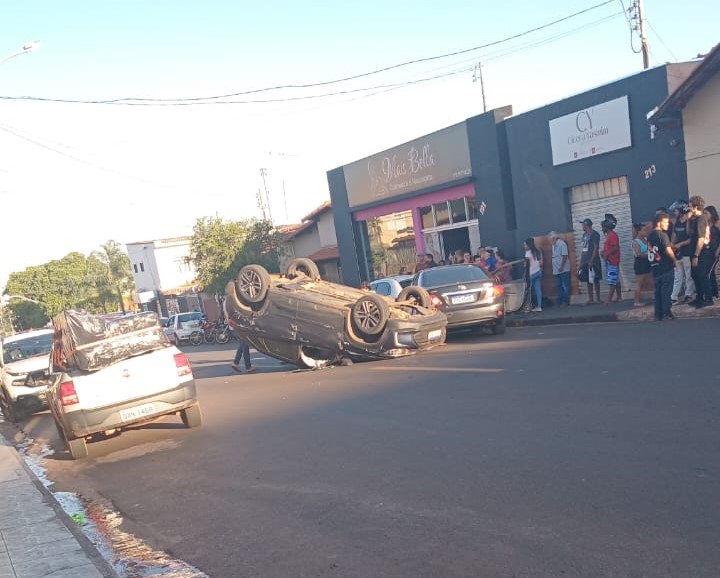 Um carro capotou no final da tarde desta sexta-feira na Avenida Paranaíba, no Bairro Boa Vista, em Monte Carmelo. O veículo ficou completamente invertido na pista, chamando a atenção de moradores e comerciantes da região. Populares se reuniram no local enquanto aguardavam a chegada do resgate e das autoridades competentes. Não foram divulgadas as informações oficiais sobre vítimas ou as possíveis causas do acidente.